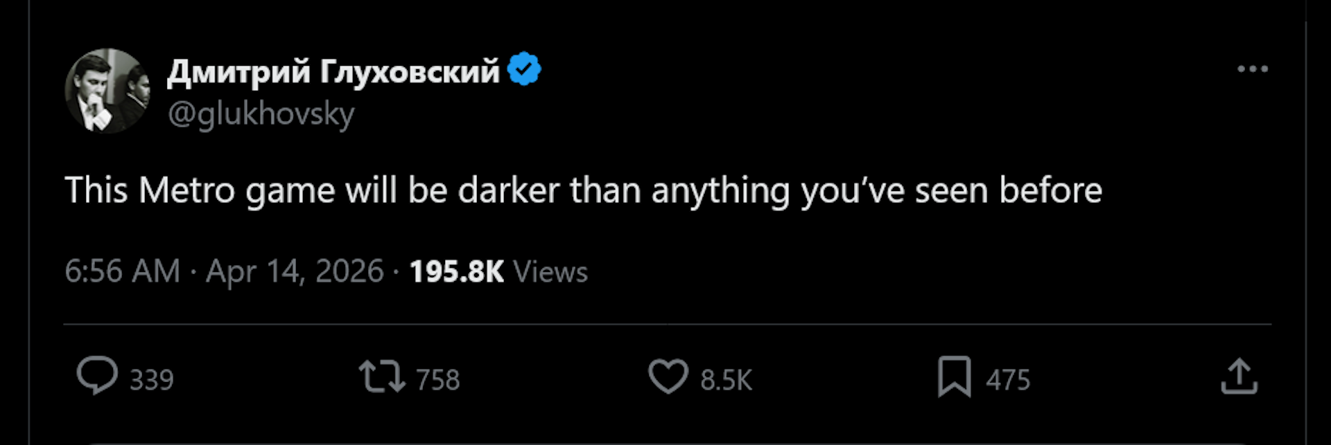 I think it’s important to take note of his specific wording here: Not that 2039 will be darker than Exodus, or darker than the full Metro series, or darker than any other post-apoc videogame you’ve ever played, but “darker than anything you’ve seen before.” I’ve been on the internet a long time, and I’ve seen some dark shit, I will tell you what, and if Glukhovsky is telling me that Metro 2039 is going to be even darker than that, all I can say is, man I hope not. I’ve had enough.