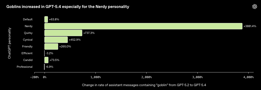 Anywho, with GPT 5.4, the goblin thing really accelerated, with mentions increasing by a staggering 3,881% with GPT’s “Nerd” personality versus GPT 5.2. That, unsurprisingly, triggered an internal investigation.
